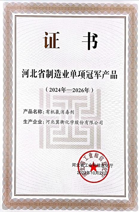 近日,河北省工業(yè)和信息化廳公布了《2024年河北省制造業(yè)單項冠軍企業(yè)名單》,河北冀衡化學(xué)股份有限公司憑借其在有機(jī)氯消毒劑行業(yè)領(lǐng)先的制造技術(shù)和全球領(lǐng)先的市場份額,榮獲“河北省制造業(yè)單項冠軍產(chǎn)品”稱號。